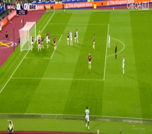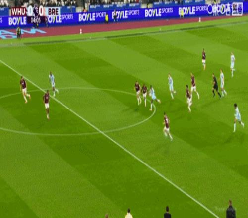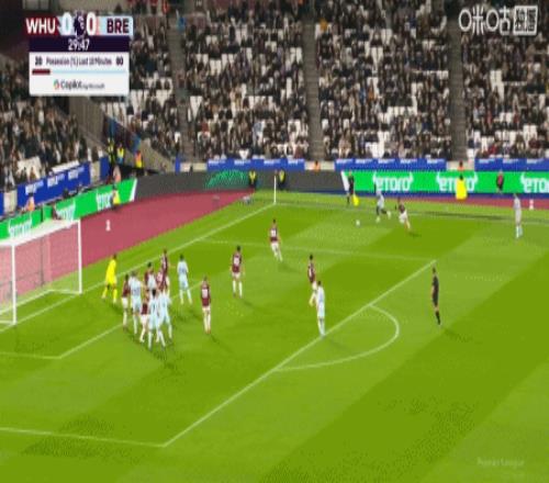 第43分钟,沙德助攻,蒂亚戈射门得分,布伦特福德1-0西汉姆联
