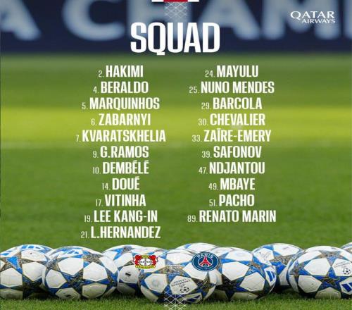前锋:7-克瓦拉茨赫利亚、9-贡萨洛-拉莫斯、10-登贝莱、14-杜埃、29-巴尔科拉、47-康坦-恩贾恩图、49-姆巴耶