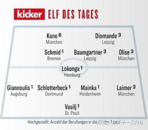 完成帽子戏法的拜仁慕尼黑前锋凯恩本赛季第6次入选周最佳阵容,和利物浦、热刺传出绯闻的RB莱比锡天才攻击手杨·迪奥曼德则第3次入选,前阿森纳球员、目前效力于汉堡的比利时中场洛孔加也首次入围。