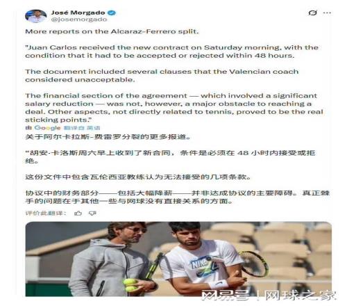 “情况从东京赛结束后就开始愈演愈烈,阿尔卡拉斯的父亲对费雷罗没办法陪伴他参加下半年的大部分赛事不满,加上费雷罗一直希望阿尔卡拉斯在自己的网球学院做更多倾向性的训练安排,这更加加剧了两个人之间的紧张关系。”一位外网网友写道。