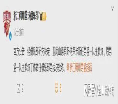 昨天,浙江男篮俱乐部官方宣布:“经俱乐部研究决定,亚历山德罗斯·法莱卡斯任男篮一队主教练,原男篮一队主教练丁伟转任俱乐部男篮总教练。”。至此,近日炒得沸沸扬扬的丁伟“下课”传闻,正式“靴子落地”。CBA江湖的“救火教练”丁伟,又一次从主教练岗位上下岗。